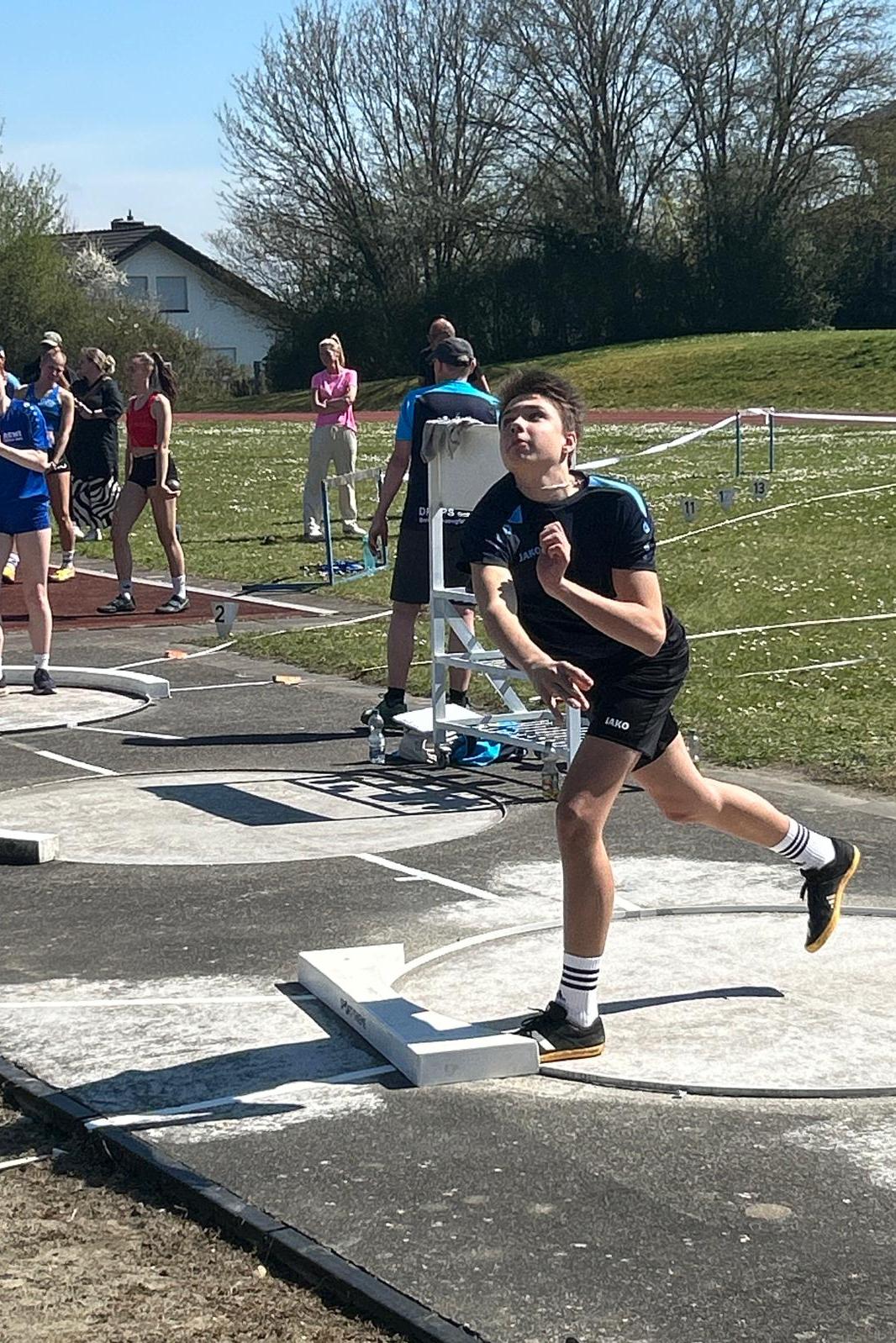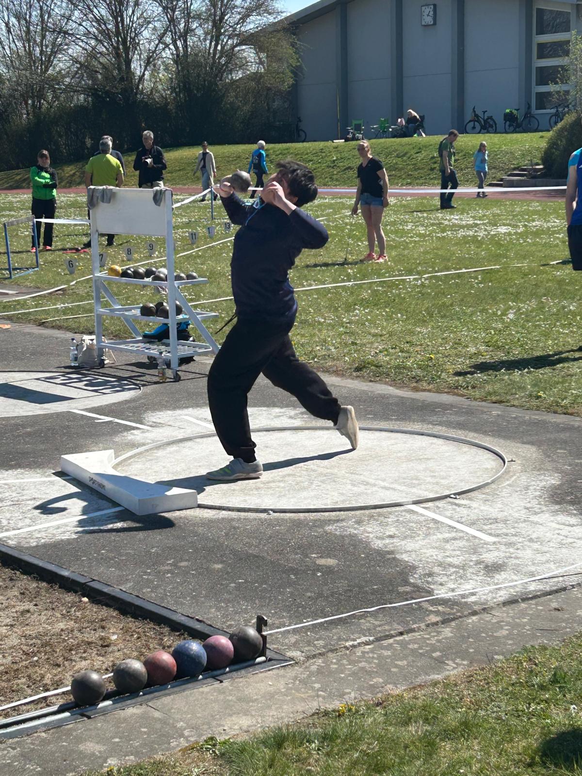 Die Leichtathletiksaison nimmt für die TSV-Athleten Fahrt auf. Die nächsten Wochenenden sind mit Veranstaltungen regelrecht vollgepackt. Nach Ostern ging es mit dem Werfertag in Altshausen in Oberschwaben los. Valentin Klein (M15) und Tom Andersch (U18) gingen dort jeweils in den Disziplinen Kugelstoß und Diskus an den Start. Tom startete den Tag im Kugel-Wettbewerb. Der erste Stoß (5kg) von Tom mit 8,30m war ein ordentlicher Einstieg in den Wettkampf. Im weiteren Verlauf sollte es aber keine Steigerung geben, was am Ende einen 7. Platz ergab. Anschließend war Valentin an der Reihe. Bereits fulminant in die Saison gestartet bestätigte er seine Form mit der 4kg-Kugel. Mit nur zwei gültigen Versuchen, die aber beide über der bisherigen Bestmarke lagen gewann er klar diese Konkurrenz. 14,62m sind eine Verbesserung seiner Bestweite von 1,54m. Mit dem Knacken der 14m-Marke hat er damit auch die Qualifikationsnorm für die Teilnahme bei den deutschen Meisterschaften übertroffen. In der noch jungen DLV-Jahresbestenliste wird er damit aktuell auf Platz 2 geführt.