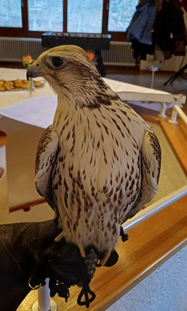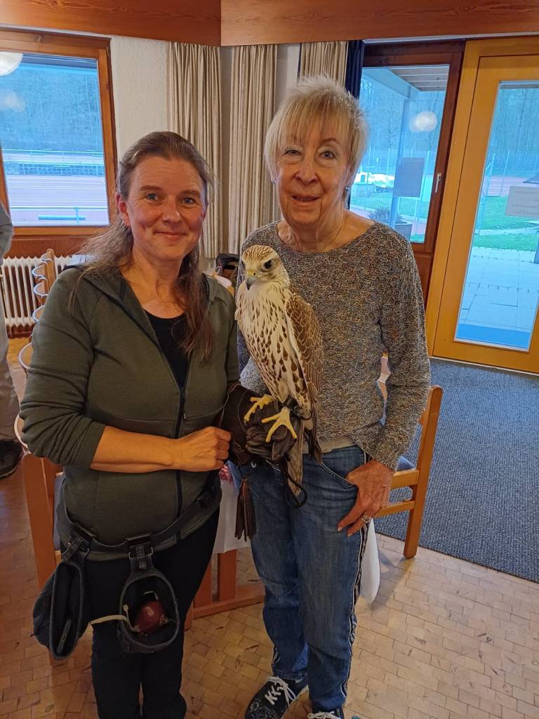 Nachdem der erste Kaffeedurst gestillt war, lauschte man dem äußerst interessanten Vortrag von Falknerin Elke Rogge, die mit ihrem Sakerfalken „Smilla“ zu Besuch war. Sie erzählte, wie sie zur Falknerei kam, wie die wilden Sakerfalken in Österreich leben und geschützt werden und zeigte anhand von „Smilla“ die interessanten Besonderheiten der Falken.